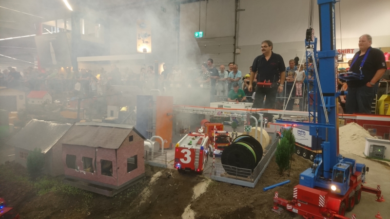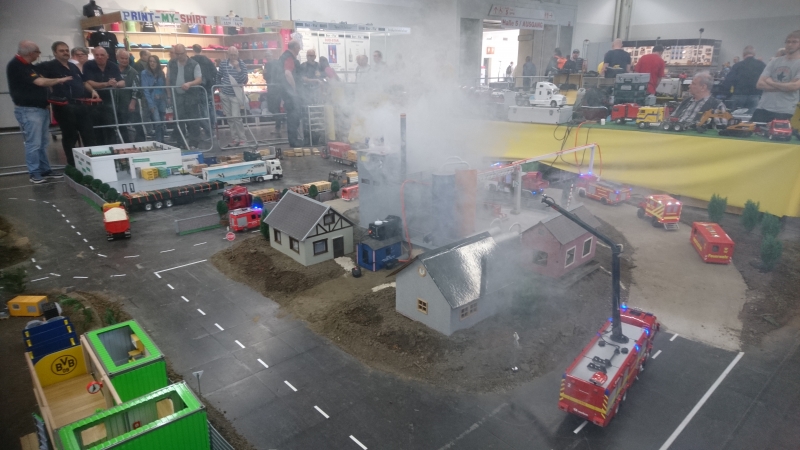 Da unser Mitglied sich auf Feuerwehrfahrzeuge spezialisiert hat, fuhr er zusammen mit dem Forum RC-EFF (RC Euro Fire Fighters) in Dortmund. Dort war er zur Bekämpfung von diversen Bränden und Technische Hilfeleistung Einsätzen im Einsatz. Es galt alle Fahrzeiten (90 min ) mindesten einen Brand zu löschen. Hierzu hatte der Forumskollege Kersten Richter eine Industrieanlage mit nach Dortmund gebracht. Dort wurde mit Hilfe einer Nebelmaschine der Effekt eines Brandes simuliert, welcher dann mit diversen Einsatzfahrzeugen gelöscht wurde.